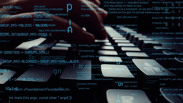Creative visual of computer programming coding and software development shown by man working on computer keyboard with overlay of computer graphic displaying abstract program codes and computer script