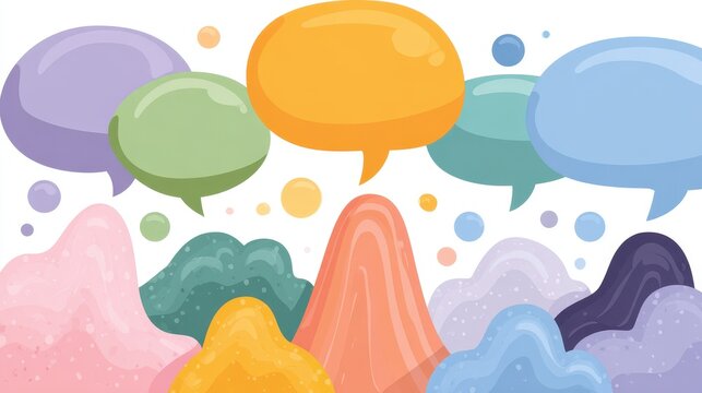 Colorful speech bubbles fill the background in various shapes and sizes showing different colors and styles for communication