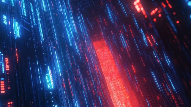 A digital data stream visualized as a wall of glowing blue and red lines in a dark server room