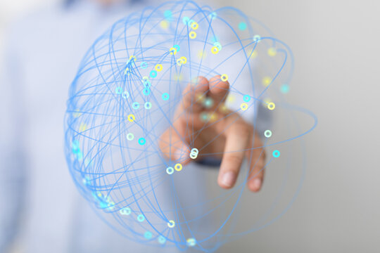 Hand interacting with a digital network, representing global connectivity and data visualization.
