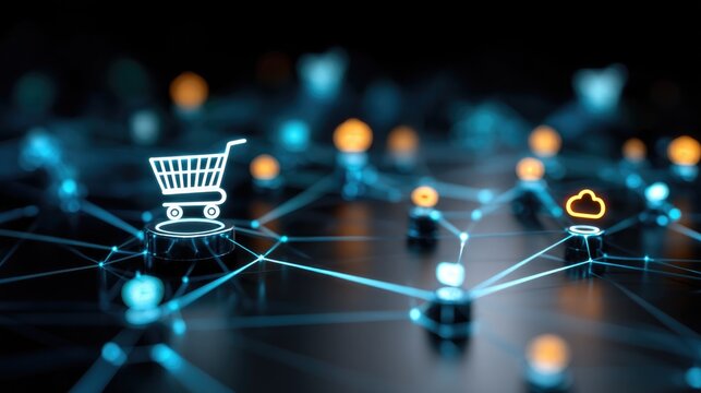 Glowing orange circular nodes linked by thin lines on a dark blue textured surface with scattered blue lights, conveying a futuristic interconnected digital energy