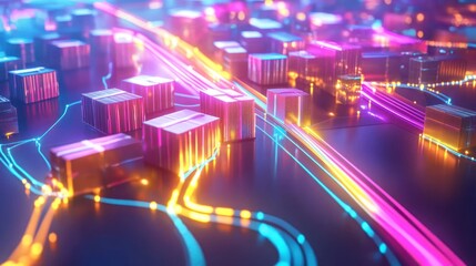 Futuristic cityscape: blurred neon lights in bokeh style - vibrant urban night background for modern designs and concepts