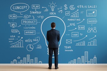 Businessman looking at strategy and marketing concept graphics on a blue background for innovation and idea development visualization purpose.