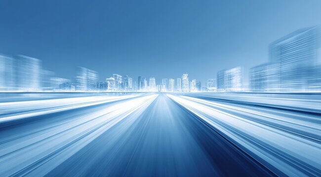 dynamic abstract business cityscape with glowing light trails, multiple exposure effect of skyscrapers and digital data streams in blue tones
