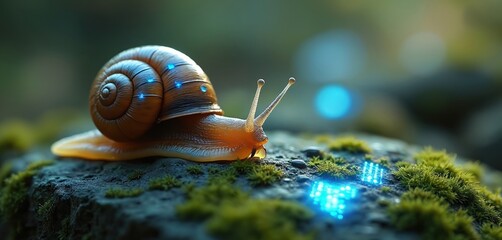 Robotic snail moves across mossy rock, leaving glowing digital pixel trail. Futuristic creature blends nature and technology with soft blue light accents on shell and fading footprints.
