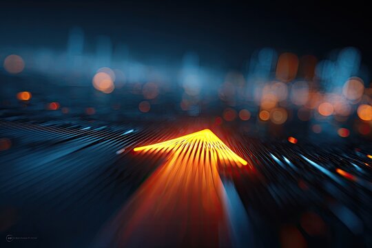 Futuristic digital landscape with glowing blue upward arrows representing progress and growth on a dark high-tech background