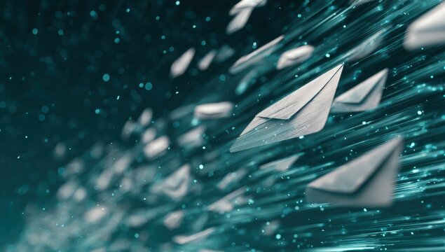 Digital communication and information exchange through email networks on a blue neon cyberspace background