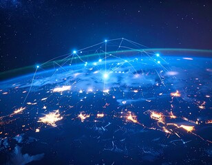 Global digital network sunrise over curved planetary horizon with connected nodes and ai