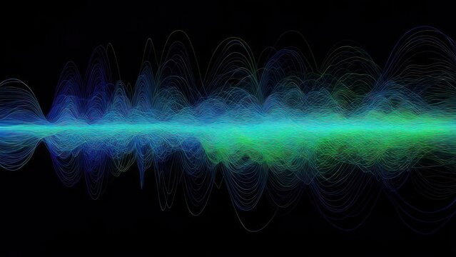 Dynamic abstract sound wave visualization with vibrant blue and green gradients on black background