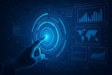 Futuristic data visualization interface with graphs and world map