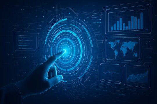 A World Map Displayed on a Futuristic Computer Screen with Various Charts and Graphs