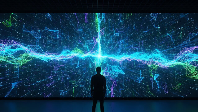 Silhouetted people stand before a large screen displaying complex blue digital data, graphs, and charts in a modern, reflective space.