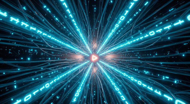 A vibrant digital illustration of glowing blue lines and codes radiating from a central point