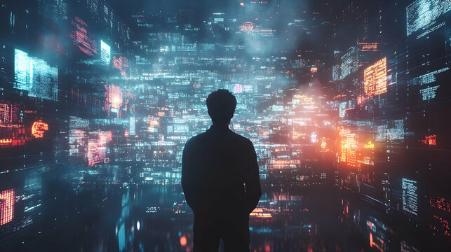 Silhouette of person facing a digital wall of data.