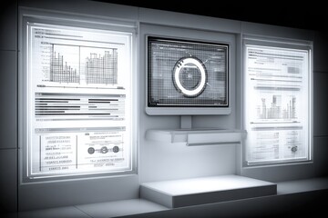Modern data wall with glowing displays.  Panels showing graphs, charts, and digital data.  Sleek, minimalist design