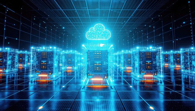 Abstract digital illustration of data servers with a glowing cloud in a network grid for technology.