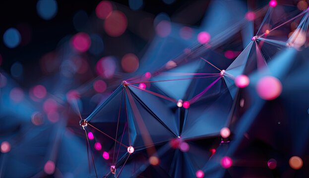 Abstract network design featuring glowing pink orbs connected by blue geometric shapes