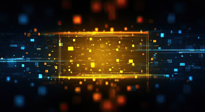 Digital abstract with a glowing rectangular frame and floating pixelated particles