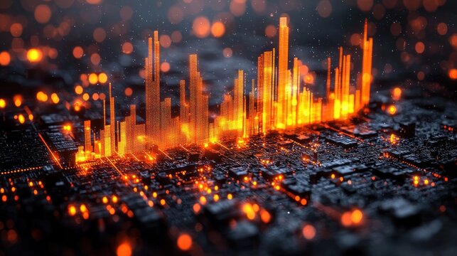 Abstract circuit board landscape with glowing orange bars and bokeh