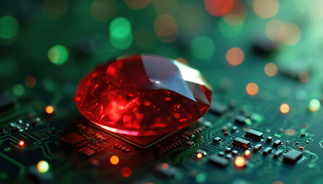 Macro view of faceted red gemstone on green circuit board. Electronic components glow with orange and green lights, creating abstract digital tech pattern. Shiny surface reflects data streams.