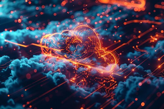 Futuristic digital cityscape with glowing cubes and cloud computing elements.
