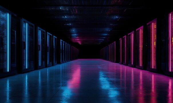Futuristic server room illuminated by vibrant neon lights, showcasing rows of data racks in a modern, high-tech environment.
