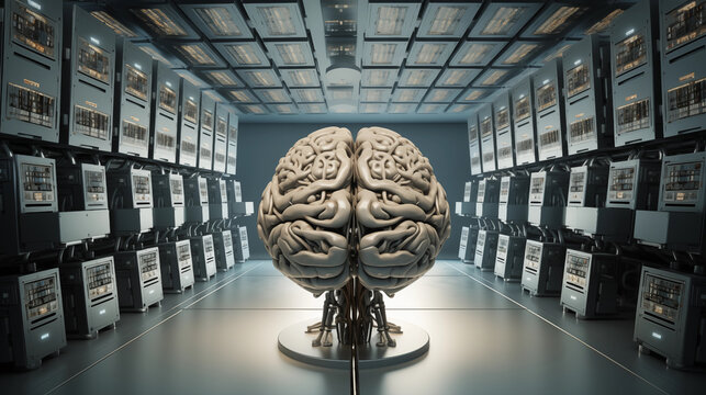 AI agent digital brain glowing over server racks, data center background, computation, deep learning