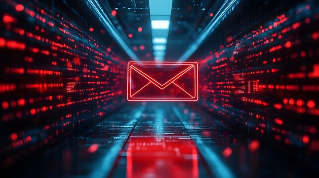 Digital Mail Network: A captivating digital representation of an email within a network of data, bathed in the cool glow of a neon environment.