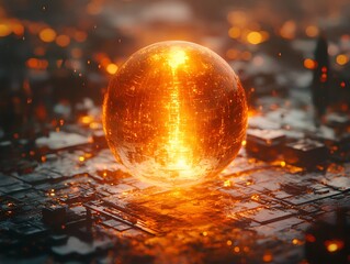 Fiery orb hovering above intricate technological surface under dim lights