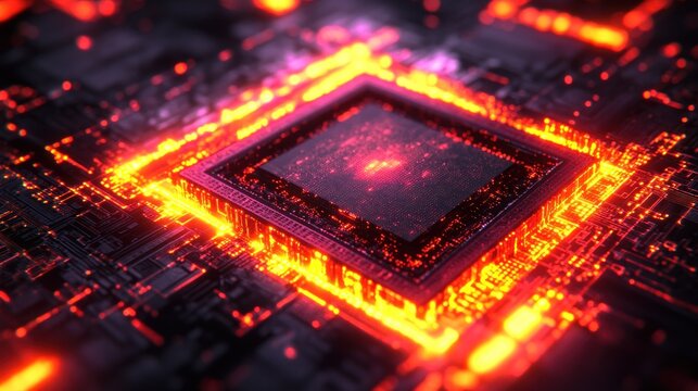 Glowing computer chip with intricate circuit details, warm fiery colors