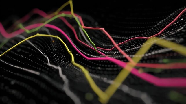 Dynamic digital stream with vibrant multicolored data flow on black background, perfect for futuristic tech concepts, data visualization, or modern abstract design projects