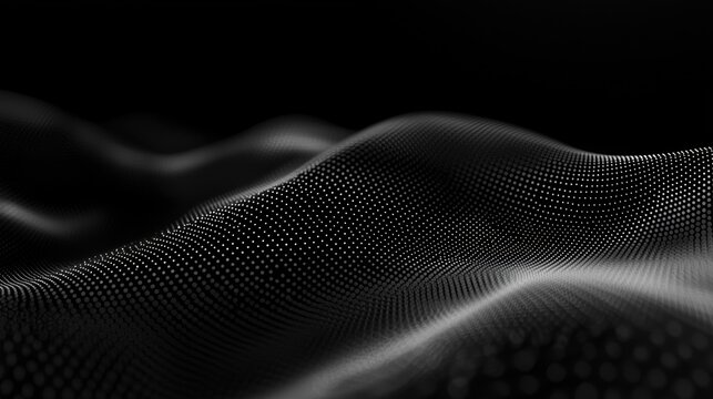 Abstract waves of colorful dots on a black background with a subtle grid pattern in the back