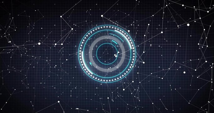 Displaying central HUD element with concentric circles over dark grid, connecting white nodes