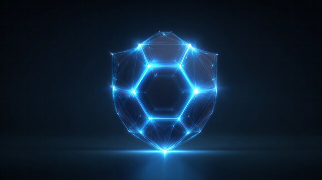 Glowing blue geometric structure resembling a protective shield hovers against a dark background