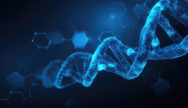 A glowing blue DNA strand spirals against a dark background with hexagonal shapes