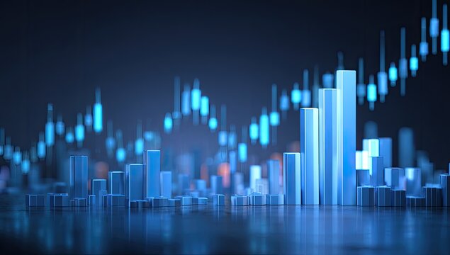 Overlaid stock market graph over a blurred cityscape during sunrise/sunset with warm hues