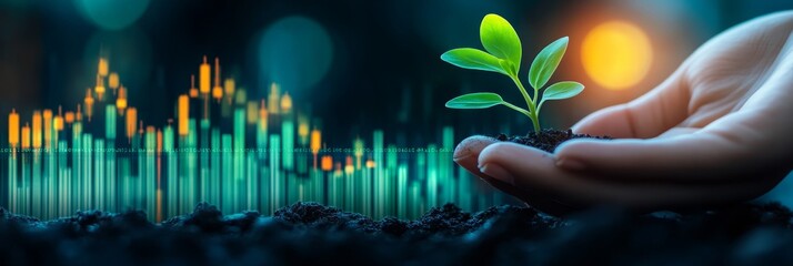 Growth And Investment. Stock Graph And Hand Holding Seedling Over Digital Blur Chart.