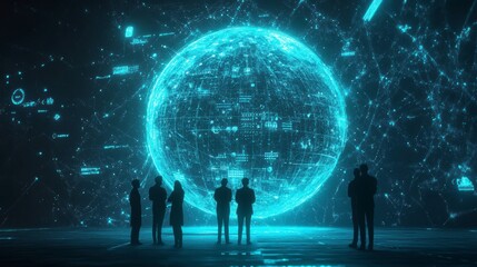 Silhouetted figures observing a glowing digital globe displaying data streams and connections.