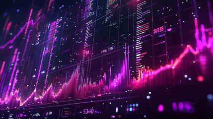 A vibrant digital visualization featuring abstract graphs and lines in shades of pink and purple, representing data flow and technology.