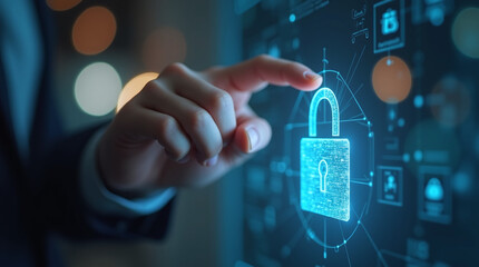 close-up hand touching floating lock icon on holographic interface, futuristic cyber touch screen, bokeh lights in background
