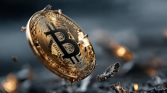 Golden Bitcoin symbol floats against a dark background, symbolizing digital wealth, decentralized power, and the futuristic allure of cryptocurrency in a mysterious and evolving financial world.