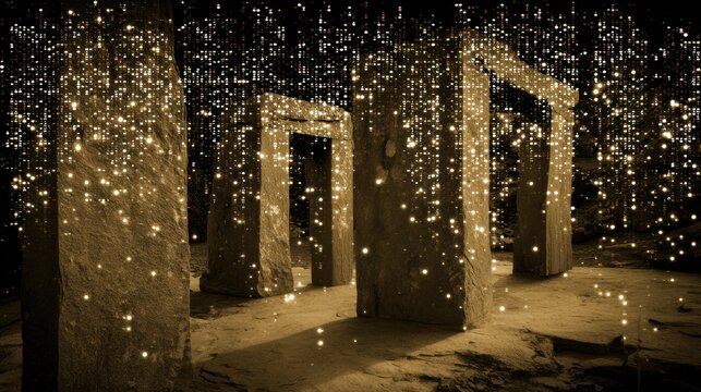 Ancient stone inscriptions form a pathway that represents data flow, blending history with concepts of intelligence and communication.