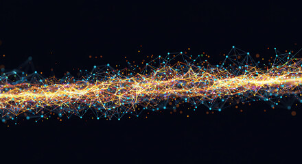 Digital network structure representing data transfer and complex interconnections, illuminating the dark space with glowing lines and elements in warm orange and yellow colors