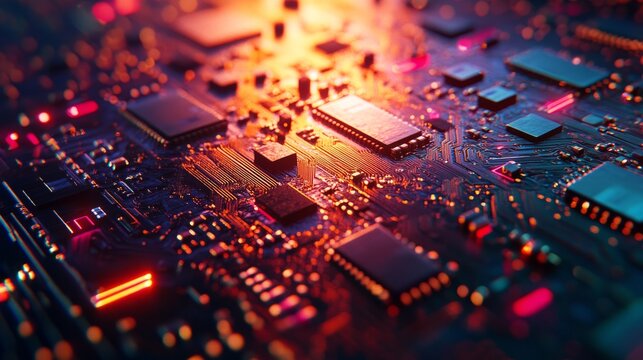 This vibrant circuit board displays a complex arrangement of microchips and circuitry, illuminated by warm orange and red lights. The advanced technology creates a striking visual effect