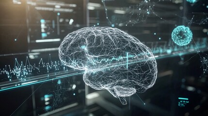 Futuristic glowing blue holographic brain projection emanating light and energy on a dark textured surface