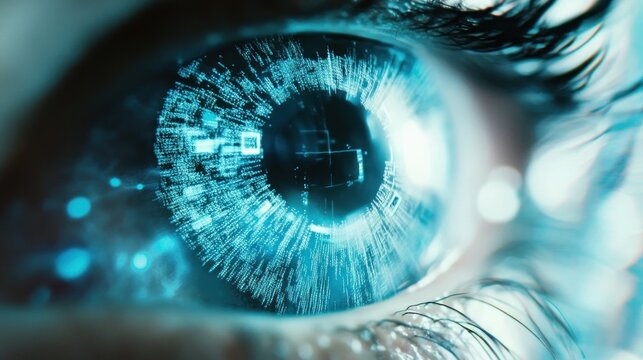 Close up human eye reflects abstract blue digital data streams. Futuristic iris with glowing circuits represents AI insights and future tech. Biometric scan processes information for smart systems.