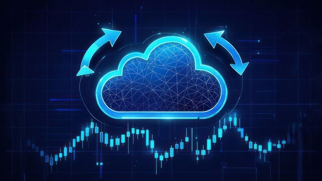 Dynamic cloud computing graphic represents data flow and financial market trends with futuristic digital interface and upward arrows showing growth.