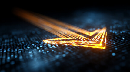 A glowing digital arrow signifying progress and direction in a tech-inspired environment.