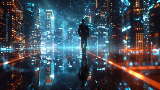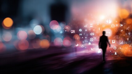 Business professional walking at night with augmented reality icons, reflecting technology and innovative concepts