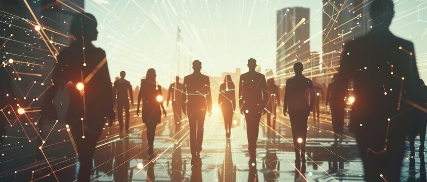 Silhouettes with network lines, city backdrop, dawn.